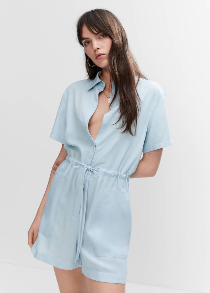 100% liocel. Estilo camiseiro. Desenho reto. Modelo curto. Gola camiseira. Manga curta. Dois bolsos aos lados. Dois bolsos de aplicação atrás. Fecho de botões à frente. Cintura com cordão ajustável
