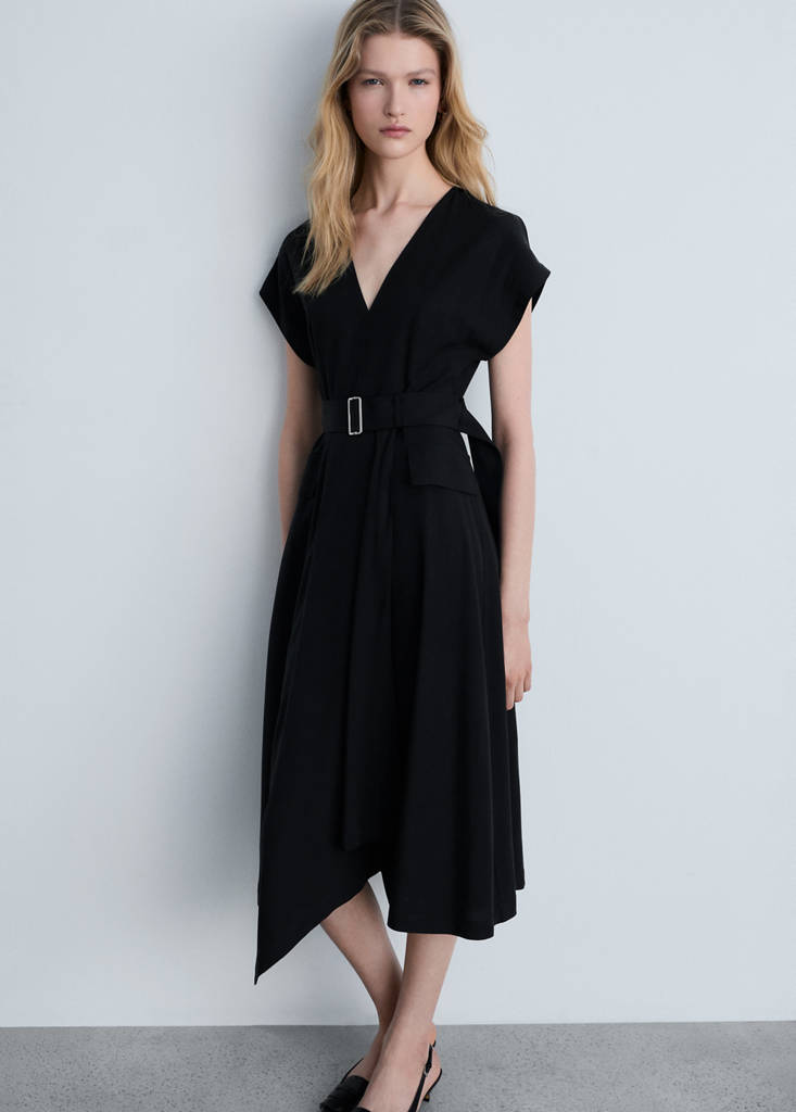 Design midi. Design evasé. Gola em V. Sem mangas. Passantes para cinto. Cinto com fecho de fivela. Dois bolsos de aba à frente. Baixo assimétrico. Fecho de correr na parte posterior. Disponível Plus