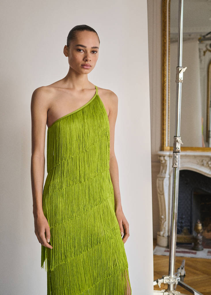Imirja no dinamismo e na elegância deste vestido com franjas sobrepostas num suave tecido de viscose. O seu decote assimétrico dá um toque moderno e sofisticado, deixando um ombro descoberto para um 'look' distinto. Com cada movimento, as franjas ganham vida, pelo que esta peça é a escolha perfeita para brilhar em qualquer evento. Ao aliar estilo e fluidez na perfeição, será um essencial do seu guarda-roupa. Design de franjas. Design midi. Design reto. Decote assimétrico. Alça fina. Fecho de correr lateral. Forro interior. Coleção festa, cerimónia e comunhão. Os artigos da coleção CAPSULE podem ser trocados ou devolvidos no prazo de 14 dias a contar a partir da data de envio. Esta peça pertence à nossa coleção de evento, desenhada para te tornar na convidada perfeita em qualquer festa, casamento ou cerimónia