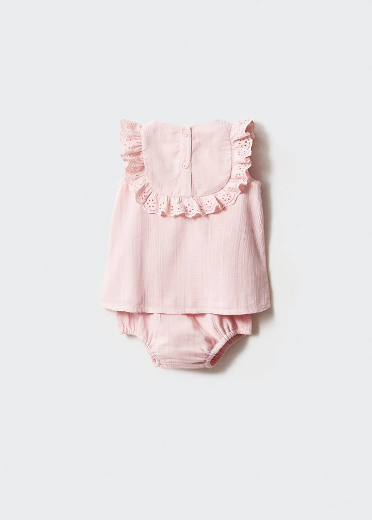 100% algodão. Conjunto de vestido e calções. Design com folhos. Gola redonda. Cintura com elástico. Fecho posterior. Fecho de botões