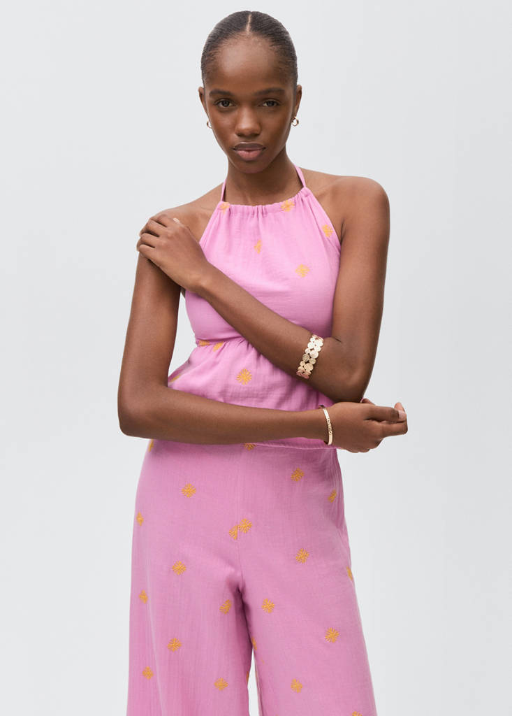 Tecido de algodão. Tecido bordado. Modelo de sóis. Desenho culotte. Design crop. Cintura alta. Elástico atrás da cintura. Total look