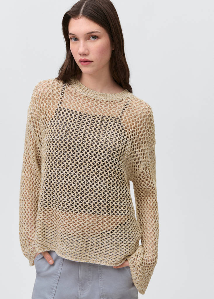Design oversize. Design metálico. Design reto. Malha rendada. Gola canelada. Gola redonda. Manga comprida acampanada. Acabamentos canelados