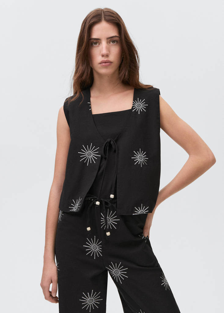100% Algodão. Design reto. Modelo bordado. Pormenor de missangas. Gola em V. Sem mangas. Fecho de laços na parte da frente. Total look