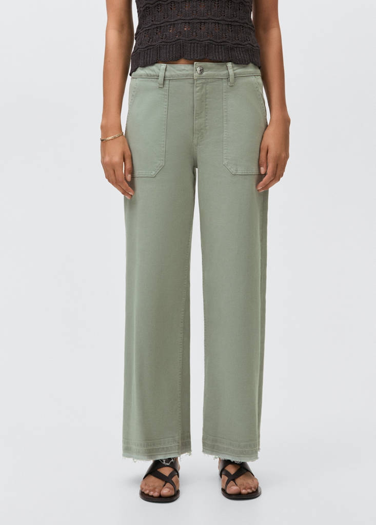 Tecido de algodão estilo cowboy denim. Desenho culotte. Cintura alta. Dois bolsos frontais. Dois bolsos de patch na parte de trás. Fecho de zíper e botão. Base desfiada
