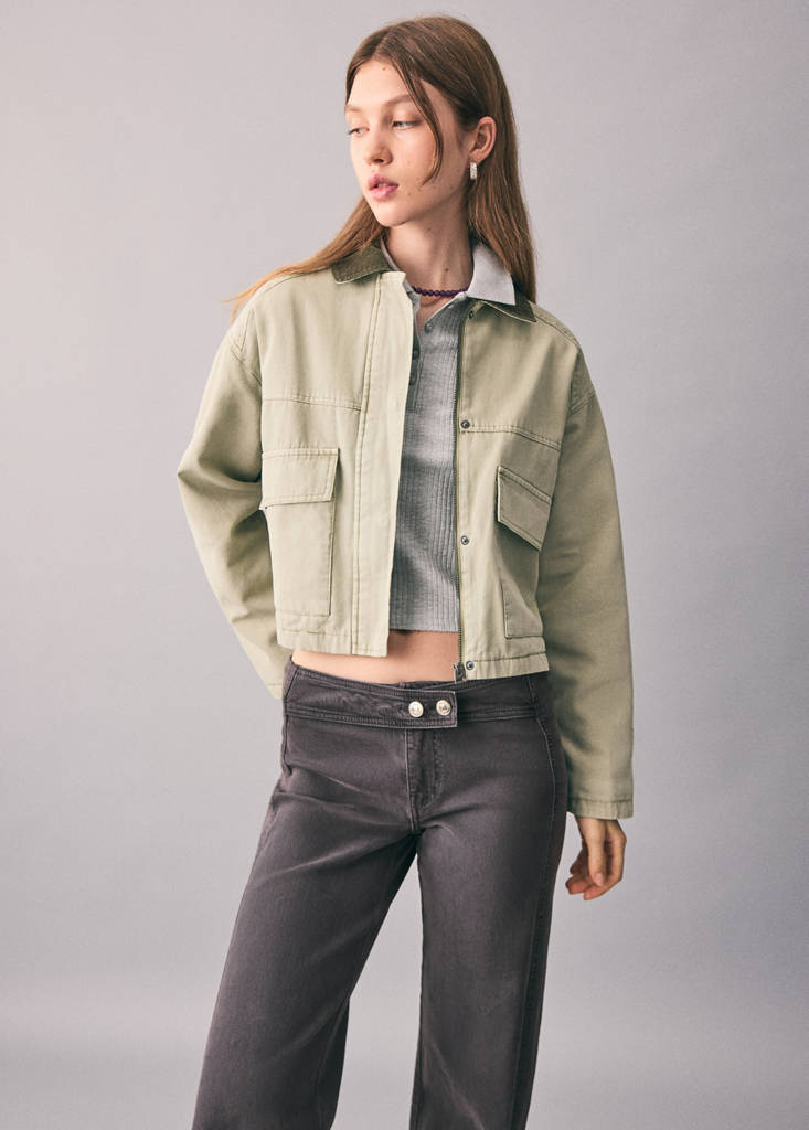 Tecido de algodão. Tecido elástico. Design longo. Desenho culotte. Cintura Regular Waist. Pormenor de botões na cintura. Fecho de botão e fecho éclair. Dois bolsos de patch na parte de trás