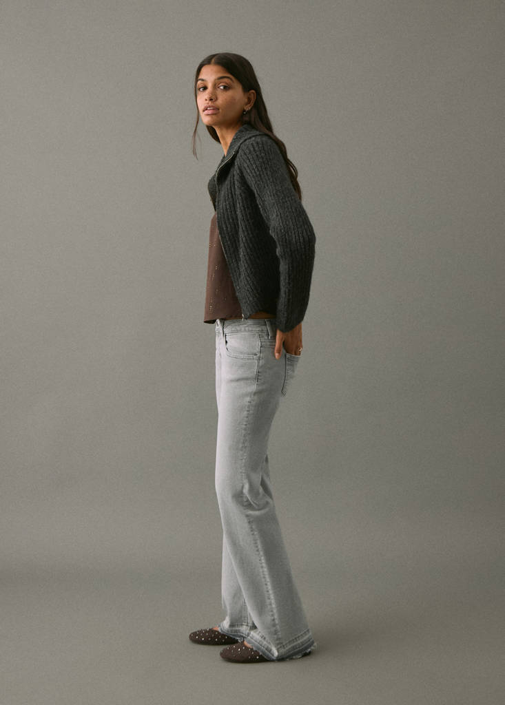 Tecido de algodão. Tecido elástico. Design longo. Estilo boca de sino. Cintura de altura baixa. Passadores para cinto. Fecho de zíper e botão. Bolso porta-moedas. Dois bolsos laterais. Dois bolsos de patch na parte de trás. Base das calças desfiada