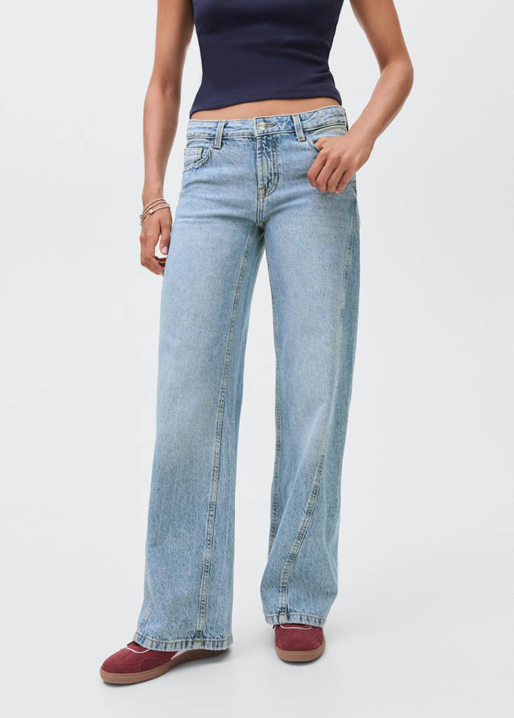 Tecido 100% algodão. Estilo de calças de ganga. Design longo. Design wideleg. Cintura de altura baixa. Passadores para cinto. Fecho de zíper e botão. Bolso porta-moedas. Dois bolsos laterais. Dois bolsos de patch na parte de trás. Detalhe costuras