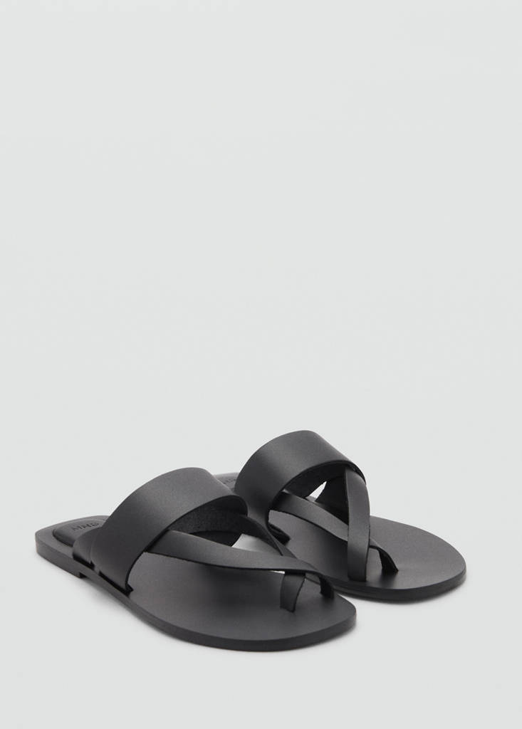 100% pele bovina. Design plano. Design de tiras cruzadas. Tira com posição para o dedo