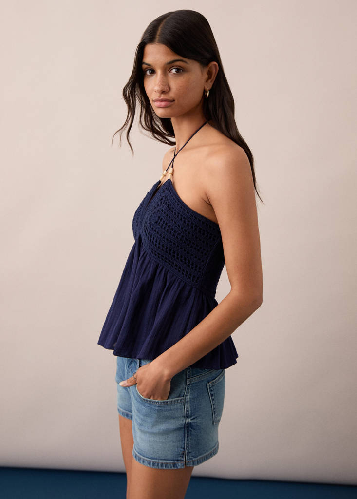 Tecido de algodão estilo cowboy denim. Design reto. Design curto. Efeito desgastado. Três bolsos na frente. Dois bolsos de patch na parte de trás. Passantes para cinto. Fecho de zíper e botão