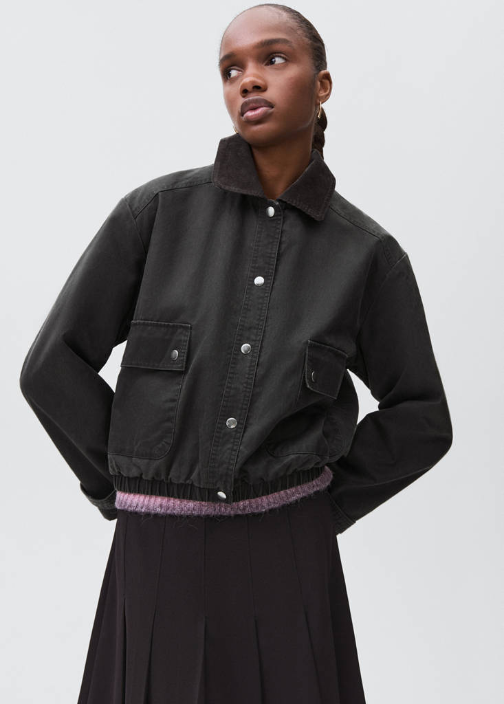 Tecido de algodão. Desenho bomber. Gola de camisa. Gola de bombazina. Manga comprida. Fecho frontal com botões. Dois bolsos de aplicação à frente