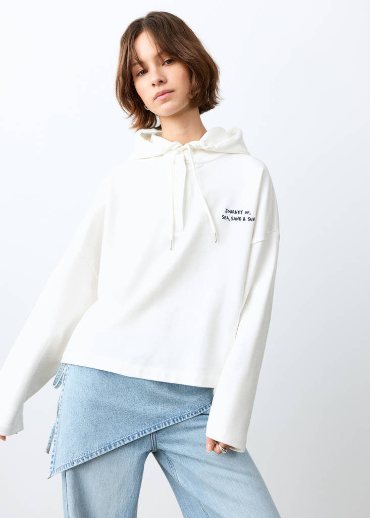 Tecido 100% algodão. Design reto. Capuz com cordão ajustável. Manga comprida. Estampado gráfico no peito