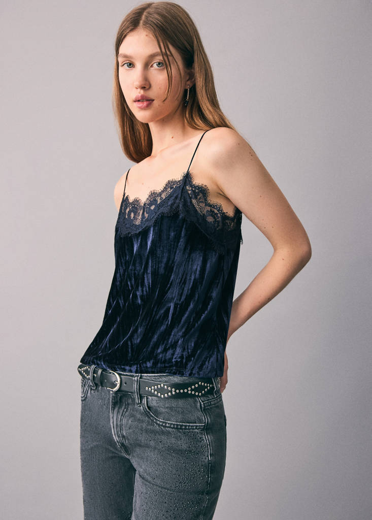 Top de veludo e rendaPreço atual [17,99 € ]17,99 €Selecione uma corAzul-marinhoSelecione o seu tamanhoXXSNão disponível. Quero!XSNão disponível. Quero!SNão disponível. Quero!MNão disponível. Quero!LNão disponível. Quero!Avisem-meAdicionar a PreferidosVer lookEnvio gratuito para a lojaTecido de veludo. Design reto. Pormenor de renda. Alças finas. Coleção festa e eventos. Coleção de Festa. Coleção Natal. Modelo com brilhoPormenores, composição e cuidados a terDisponibilidade em lojaMango StylistPergunte sobre envios, devoluções e muito maisAssistant