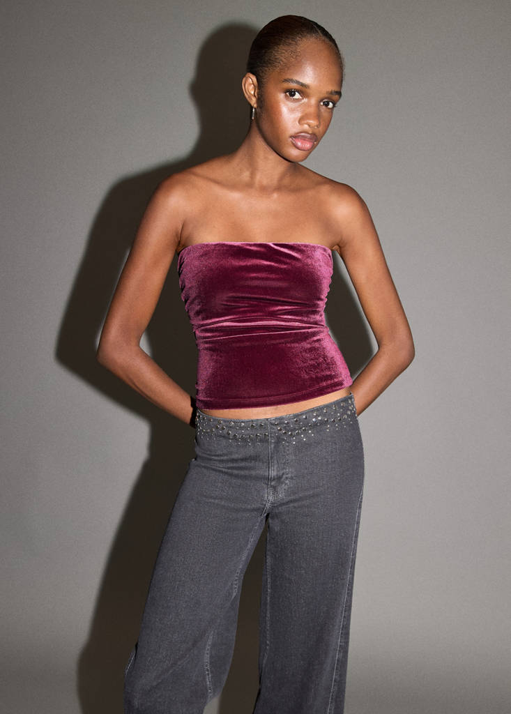 Silhueta Slim. Comprimento Crop. Gola lapela Palavra de Honra. Tecido de veludo. Design crop. Design ajustado. Decote tomara que caia. Coleção festa e eventos. Coleção de Festa. Coleção Natal. Modelo com brilho