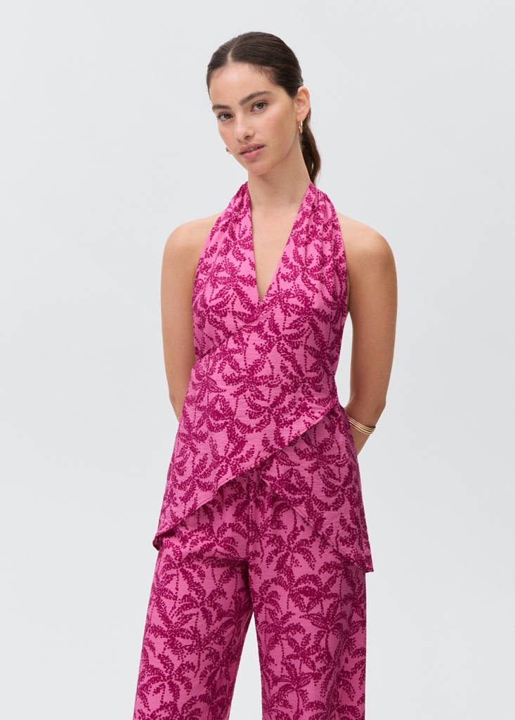 Tecido de viscose. Design estampado. Estampado de palmeiras. Gola halter. Decote em V. Estilo cruzado. Costas abertas. Fecho de laço no pescoço. Total look