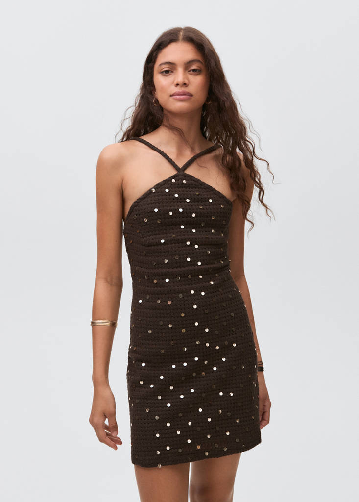 Tecido 100% algodão. Modelo de croché. Design reto. Comprimento médio. Adorno de lantejoulas. Decote halter. Alças finas. Costas abertas. Forro interior