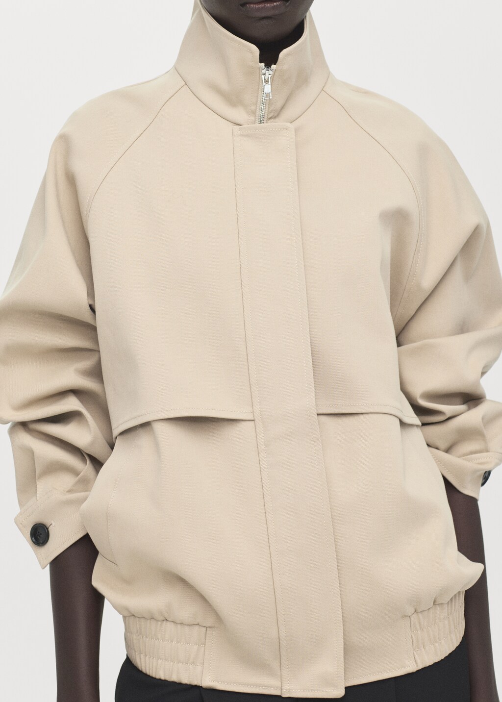 نسيج قطن. تصميم أوفرسايز. ياقة عالية. أكمام طويلة مع أساور بأزرار. جيبان جانبيان. إبزيم بسحاب مخفي. حاشية مرنة بطيات متقاربة.