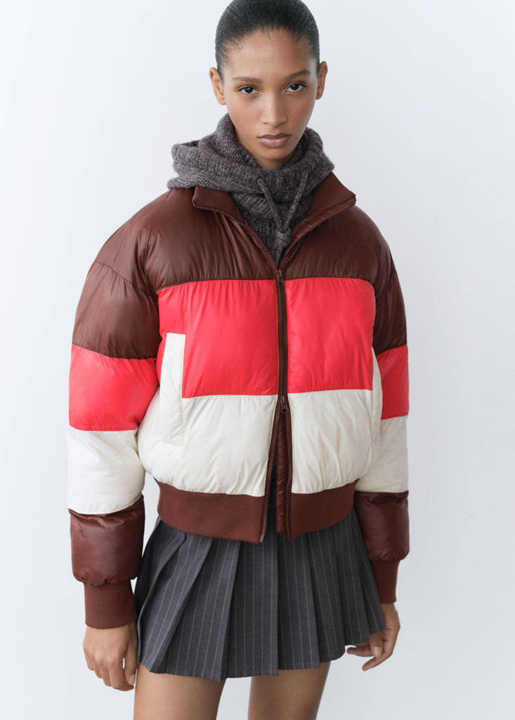 High neck. Tricolour design. Straight design. Side pockets. Inner lining. Quilted design. Long sleeves with elastic cuffs. Zip fastening on the front section