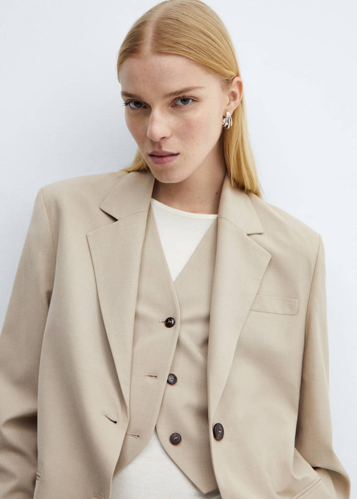 Coupe droite. Style costume. Col en V avec rabat. Revers à encoche. Manches longues et poignets boutonnés. Poche passepoilée sur la poitrine. Fermeture à deux boutons sur le devant. Ouverture arrière en bas. Doublure. Total look. Disponible en grande taille. Looks de bureau. Deux poches passepoilées à l’avant