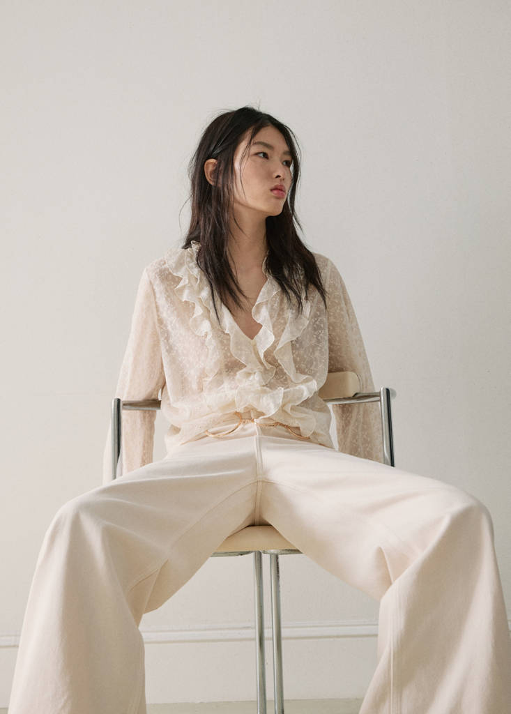 Tissu fluide. Détails brodés ajourés. Détail de volants. Coupe droite. Encolure en V. Manche longue. Sans fermeture