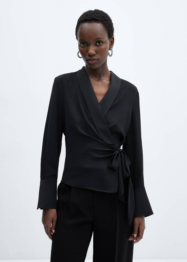 Tissu fluide. Coupe croisée. Col en V avec rabat. Manches longues et poignets boutonnés. Fermeture avant. Ruban à la taille avec fermeture à nœud. Disponible en grande taille