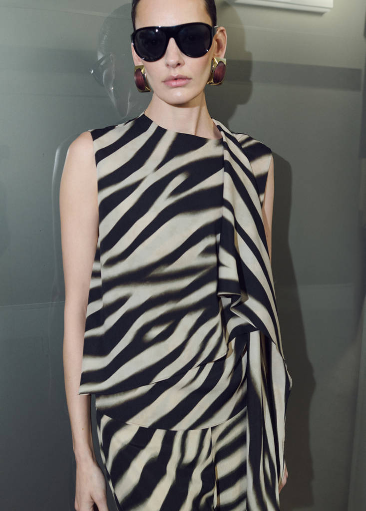 Coupe droite. Imprimé zèbre. Col rond. Empiècement foulard sur le col. Sans manches. Bretelle large. Fermeture à glissière.