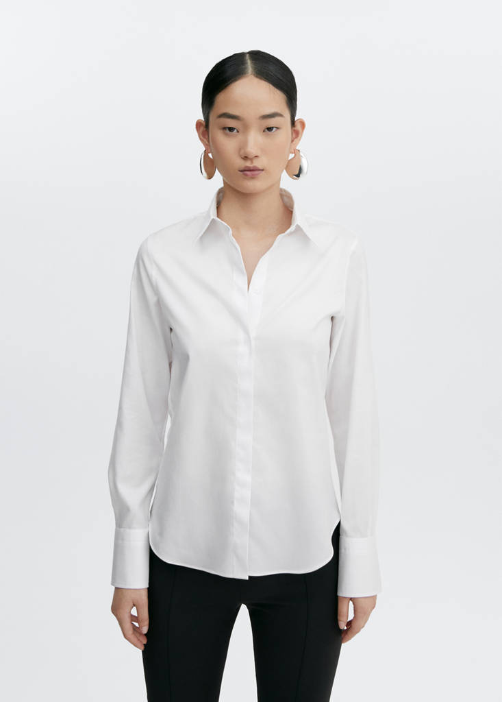 Tissu popeline de coton. Slim fit. Col chemise. Manche longue. Fermeture avant. Looks de bureau. Collection Selection