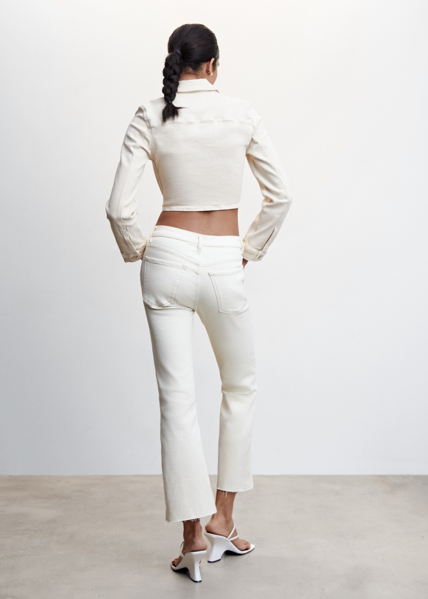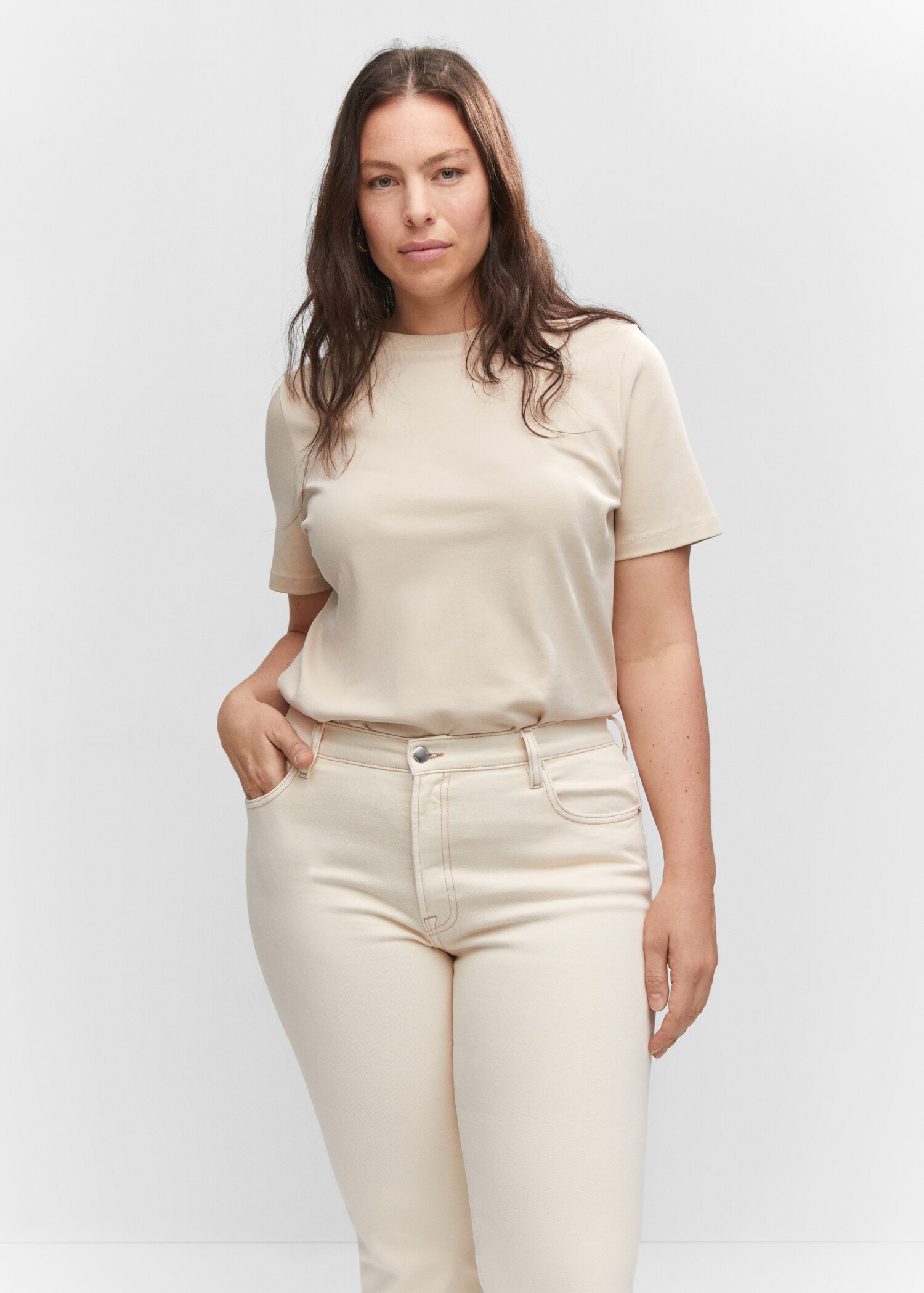 Tissu en coton de style jean. Tissu en coton organique recyclé mélangé. Tissu élastique. Flare. Style flare. Style crop. Bas effiloché. Taille haute. Passants pour la ceinture. Cinq poches. Fermeture Éclair avec bouton. Disponible Plus. Longueur intérieure 68 cm.