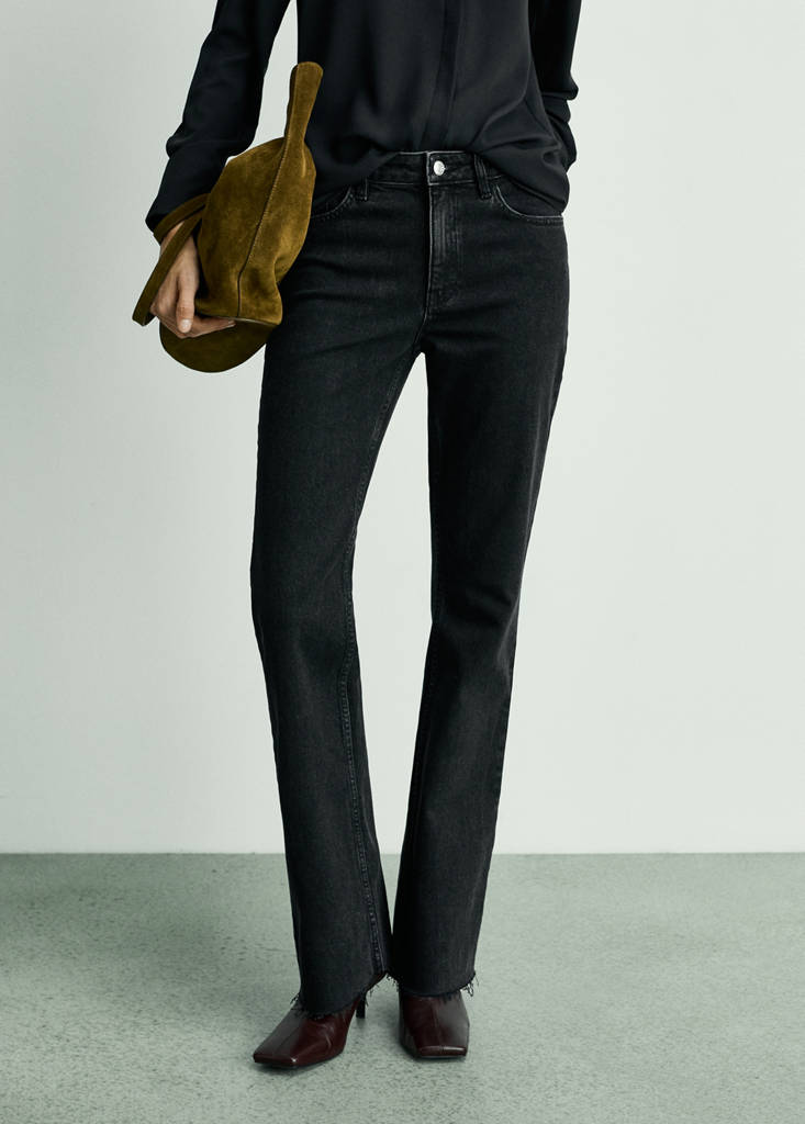 Tissu en coton de style jean. Forme évasée. Style flare. Taille mi-haute. Passants de ceinture. Cinq poches. Fermeture éclair et bouton. Bas effiloché. Extra-long. Disponible en grande taille. Longueur intérieure 83 cm