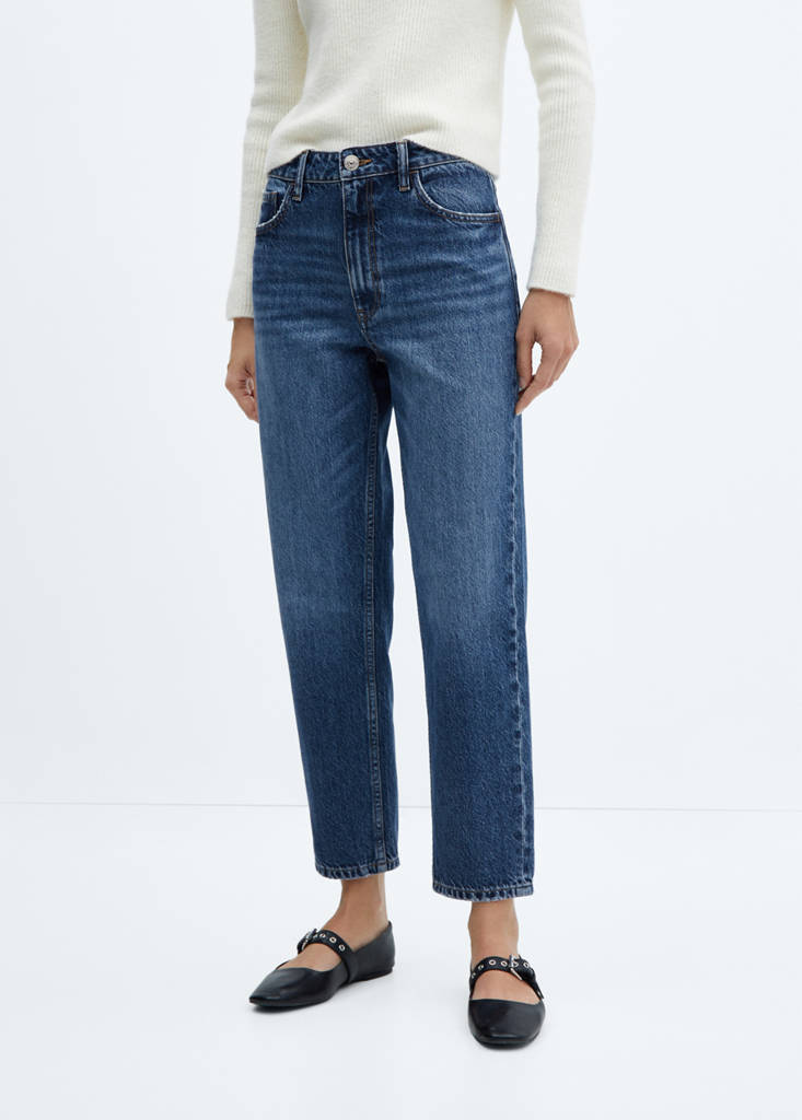 Tissu en coton de style jean. Tissu en coton recyclé. Mom-fit. Taille haute. Cinq poches. Passants de ceinture. Fermeture éclair et bouton. Longueur intérieure 70 cm. Taille plus petit que d'habitude. Disponible en grande taille