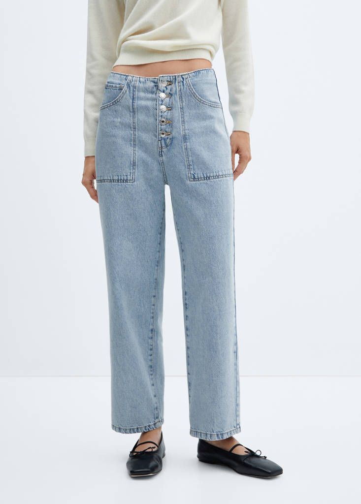 Tissu en coton de style jean, coupe droite, style crop, taille haute, sans ceinture, fermeture boutonnée sur le devant, deux poches plaquées sur les côtés, deux poches plaquées à l'arrière, pinces, longueur intérieure 67,6 cm, total look.
