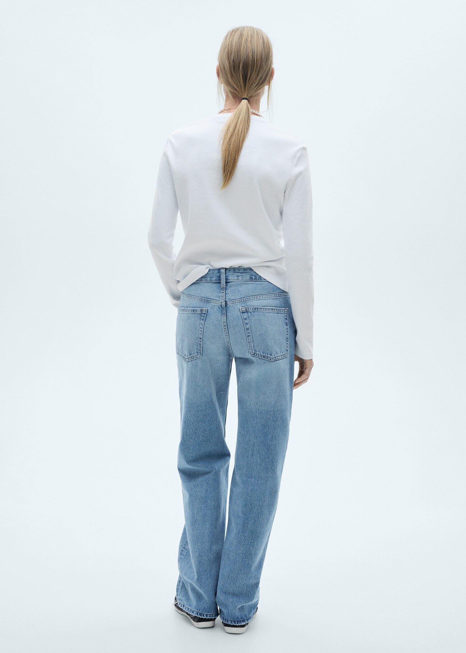 Tissu en coton style denim cowboy. Design long. Design droit. Taille mi-haute. Passants de ceinture. Deux poches avant. Poche gousset. Deux poches plaquées à l'arrière. Fermeture éclair et bouton. Longueur intérieure 82 cm.