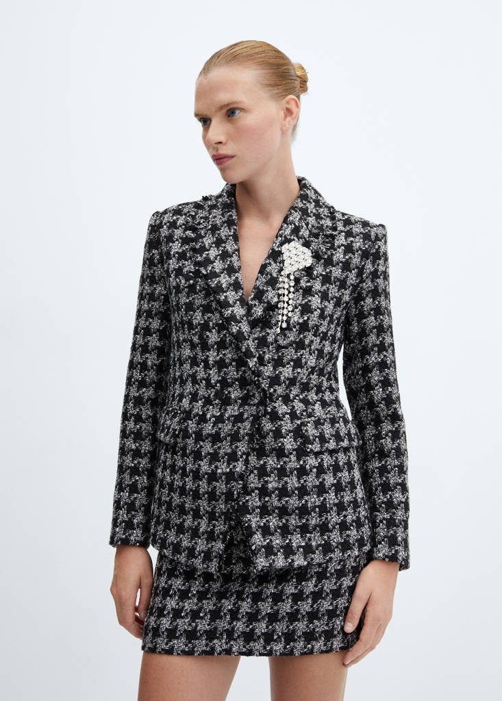 Tissu de coton mélangé, tissu tweed, coupe courte, coupe droite, imprimé pied-de-poule, fermeture Éclair avec agrafe, doublure, total look.