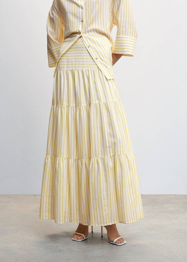 Jupe longue volantsPrix actuel [49,99 € ]49,99 €Choisissez une couleurVertLe mannequin porte la taille S et mesure 175cm.Choisissez votre tailleXSSMLXLMesuresAjouter aux FavorisVoir le lookLivraison gratuite en boutiqueTissu en ramie et coton mélangés. Tissu fluide. Coupe longue. Évasé. Motif rayé. Fermeture Éclair invisible sur le côté. Doublure. Total lookDétails, composition et entretienDisponibilité en boutique