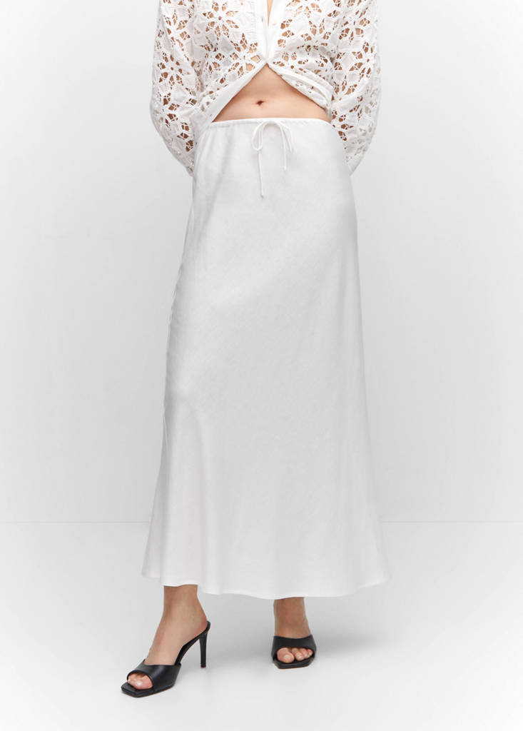Tissu en lin mélangé. Design évasé. Design long. Taille haute. Taille élastiquée. Fermeture à nœud. Bande élastique. Coupe midi