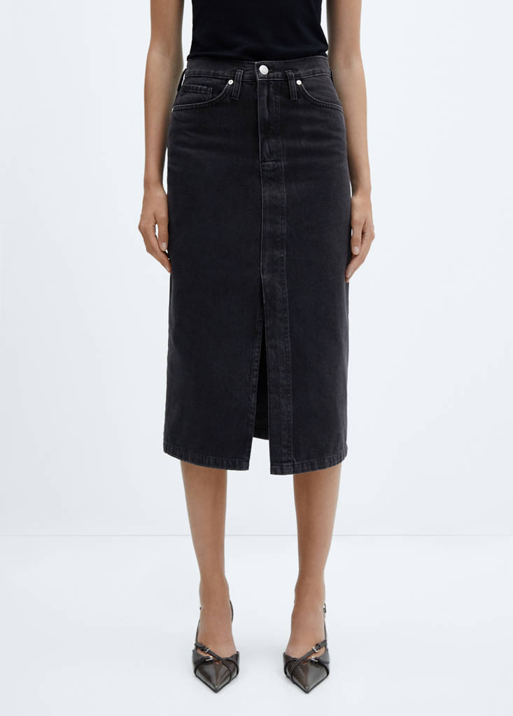 Tissu en coton de style jean. Coupe midi. Coupe droite. Fermeture éclair et bouton. Passants de ceinture. Cinq poches. Ouverture en bas à l'avant. Disponible en grande taille. Saison des festivals. Taille haute. Deux poches avant. Poche gousset. Deux poches plaquées à l'arrière. Ouverture à l'ourlet. Fermeture Éclair et bouton à l’avant