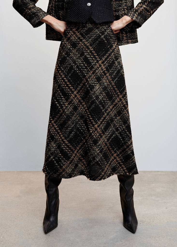 Tissu tweed. Détail de fil métallisé. Imprimé carreaux. Coupe midi. Évasé. Fermeture Éclair invisible sur le côté. Doublure. Total look