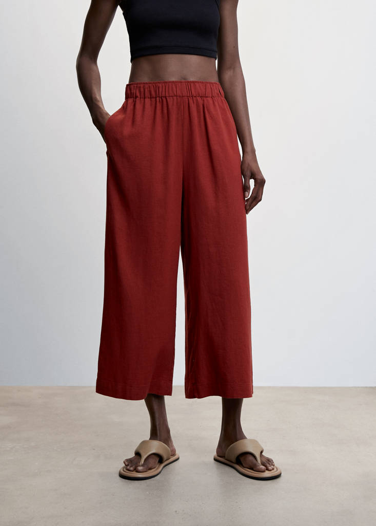 Tissu en lin mélangé. Coupe jupe-culotte. Style crop. Deux poches latérales. Taille élastiquée. Sans fermeture