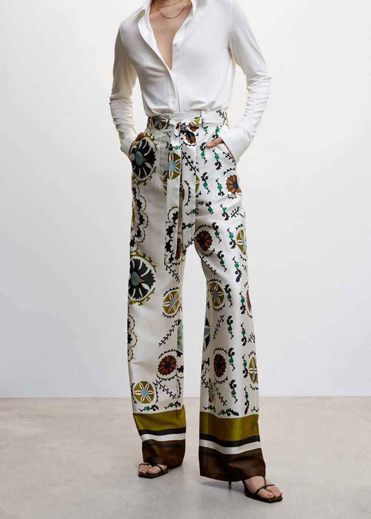 Tissu satiné. Motif palazzo. Coupe longue. Imprimé. Taille normale. Passants pour la ceinture. Deux poches latérales. Fermeture Éclair avec agrafe et bouton dissimulés. Nœud imprimé