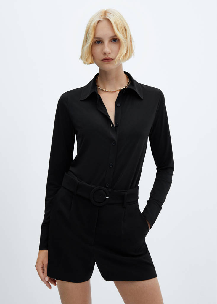 Tissu fluide. Coupe paper bag. Coupe courte. Taille haute. Passants de ceinture. Poches latérales. Ceinture amovible. Fermeture Éclair avec agrafe et bouton dissimulés. Pinces. Looks de bureau
