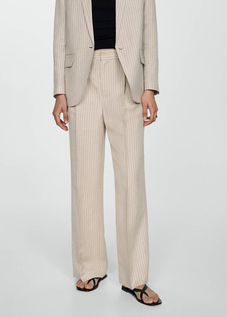 Tissu en lin mélangé. Coupe droite. Style costume. Motif à rayures. Deux poches avant. Fermeture Éclair avec agrafe et bouton dissimulés. Pinces. Passants de ceinture. Doublure. Total look