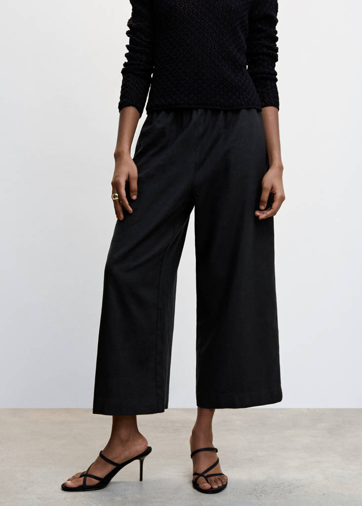 Tissu en lin mélangé. Coupe jupe-culotte. Style crop. Deux poches latérales. Taille élastiquée. Sans fermeture
