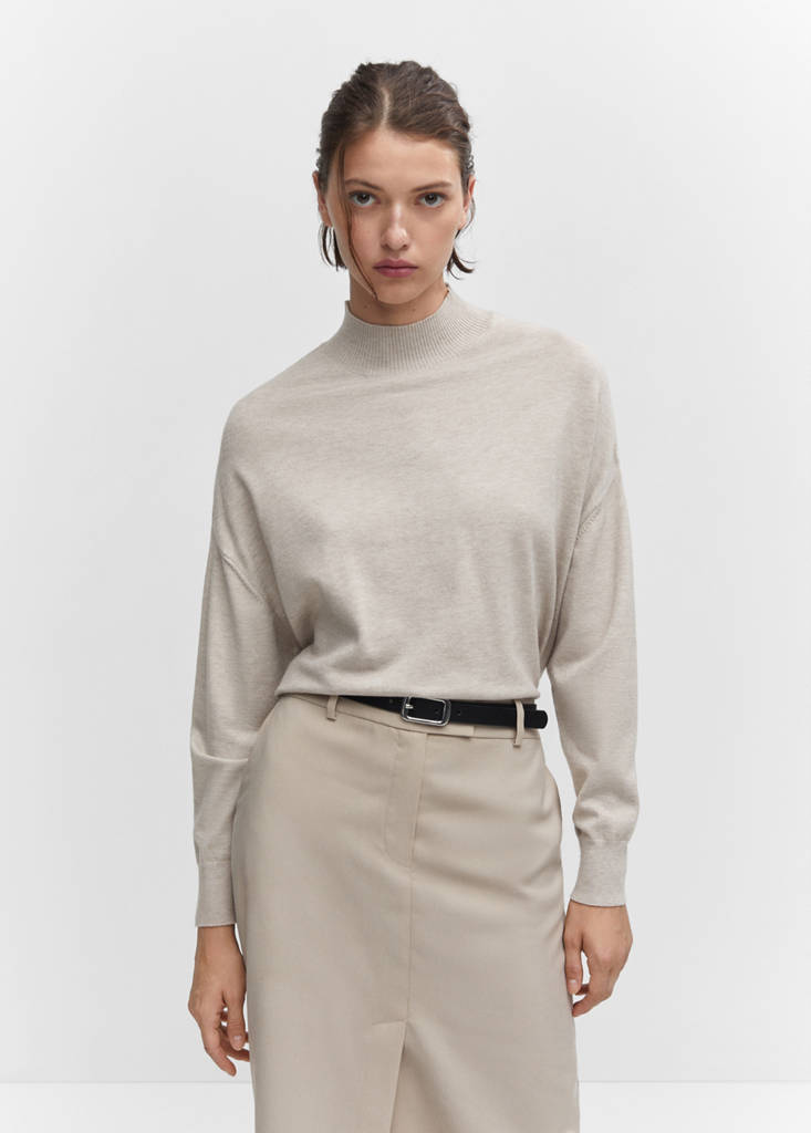 Tissu en maille fine, style oversize, coupe longue, col montant, manches longues, fentes latérales.