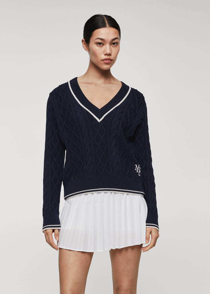 Tissu maille torsadée. Droit. Logo brodé. Col en V. Manches longues. Sans fermeture. Détail de rayures contrastantes