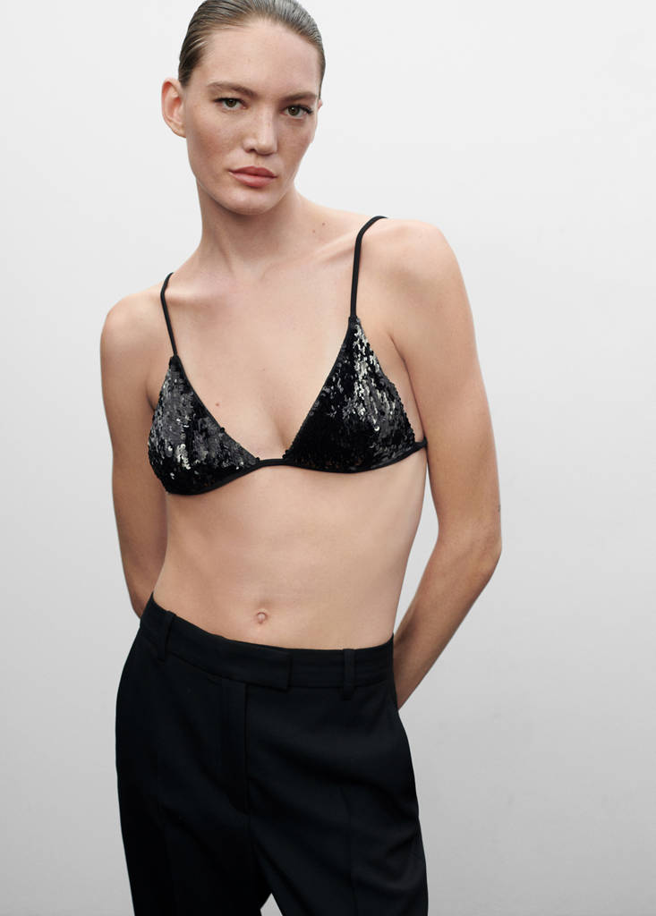 Tissu en sequins, motif triangulaire, bretelles fines ajustables, fermeture agrafe à l'arrière, doublure, collection fêtes et cérémonies.