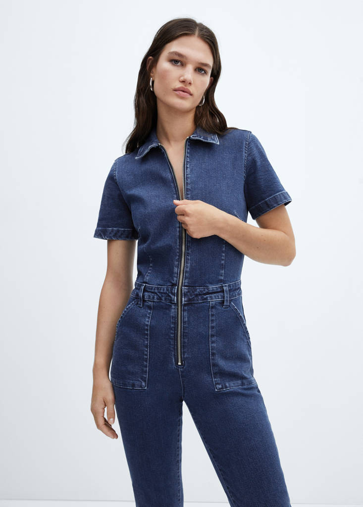 Tissu en coton de style jean. Design long. Coupe droite. Manches courtes. Passants de ceinture. Deux poches latérales. Deux poches plaquées à l'arrière. Fermeture Éclair sur le devant. La couleur peut varier selon le modèle. Col classique