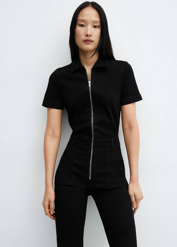 Tissu en coton de style jean. Design long. Coupe droite. Manches courtes. Passants de ceinture. Deux poches latérales. Deux poches plaquées à l'arrière. Fermeture Éclair sur le devant. La couleur peut varier selon le modèle. Col classique