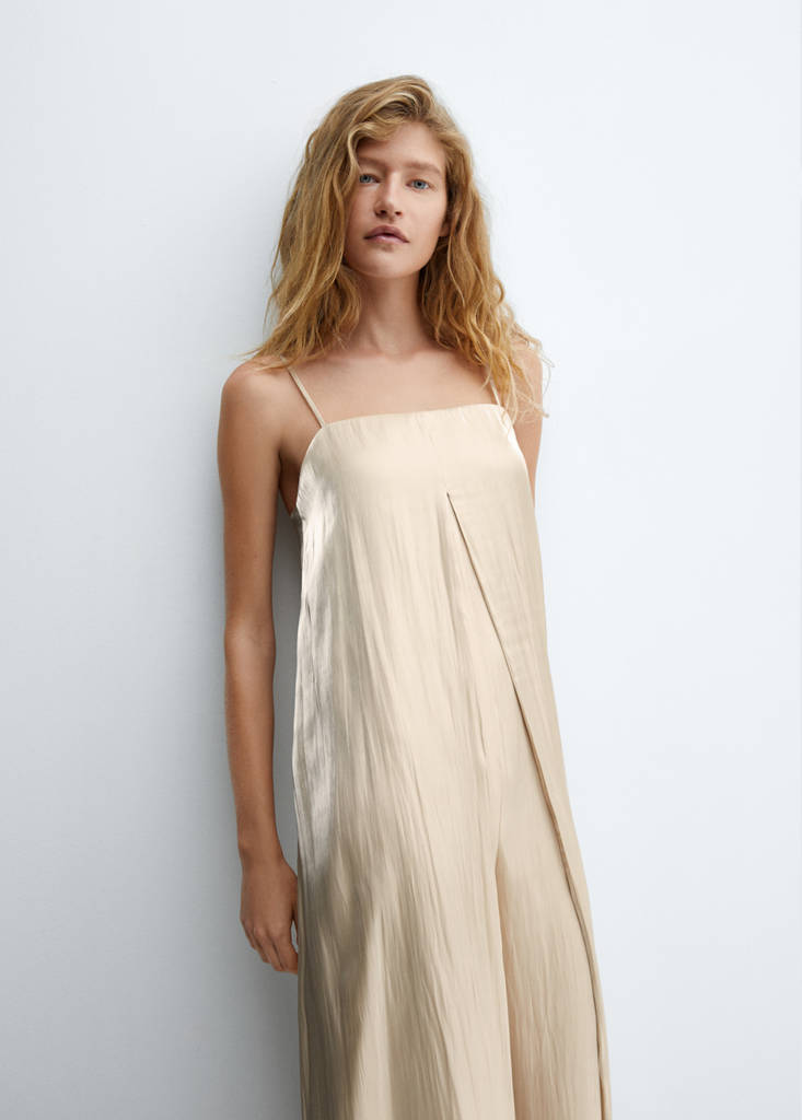 Tissu fluide. Tissu satiné. Motif palazzo. Design long. Col droit. Ouverture à l'avant. Bretelles fines. Doublure