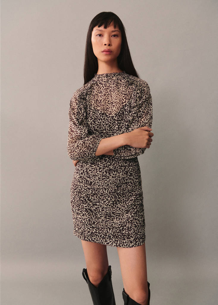 Tissu fluide. Coupe courte. Imprimé animal. Broderie léopard. Col rond. Manche longue. Fermeture par bouton à l'arrière. Détails drapés. Doublure. Coupe cintrée