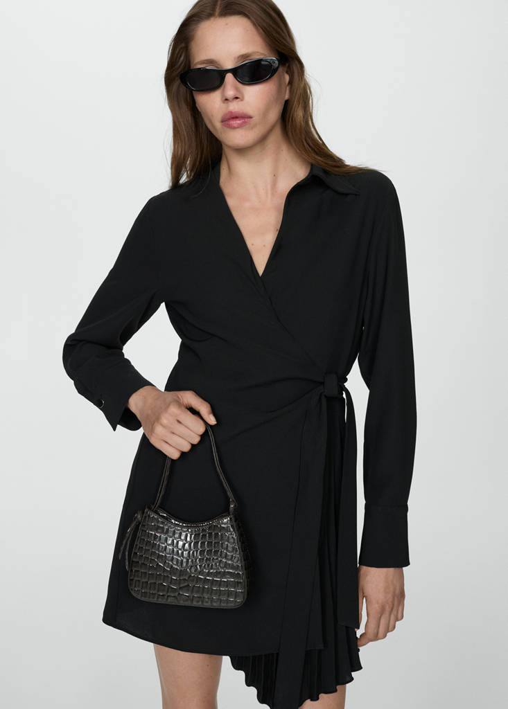 Tissu fluide. Coupe courte. Coupe droite. Coupe croisée. Col chemise. Manches courtes. Fermeture par lien latéral. Détail plissé