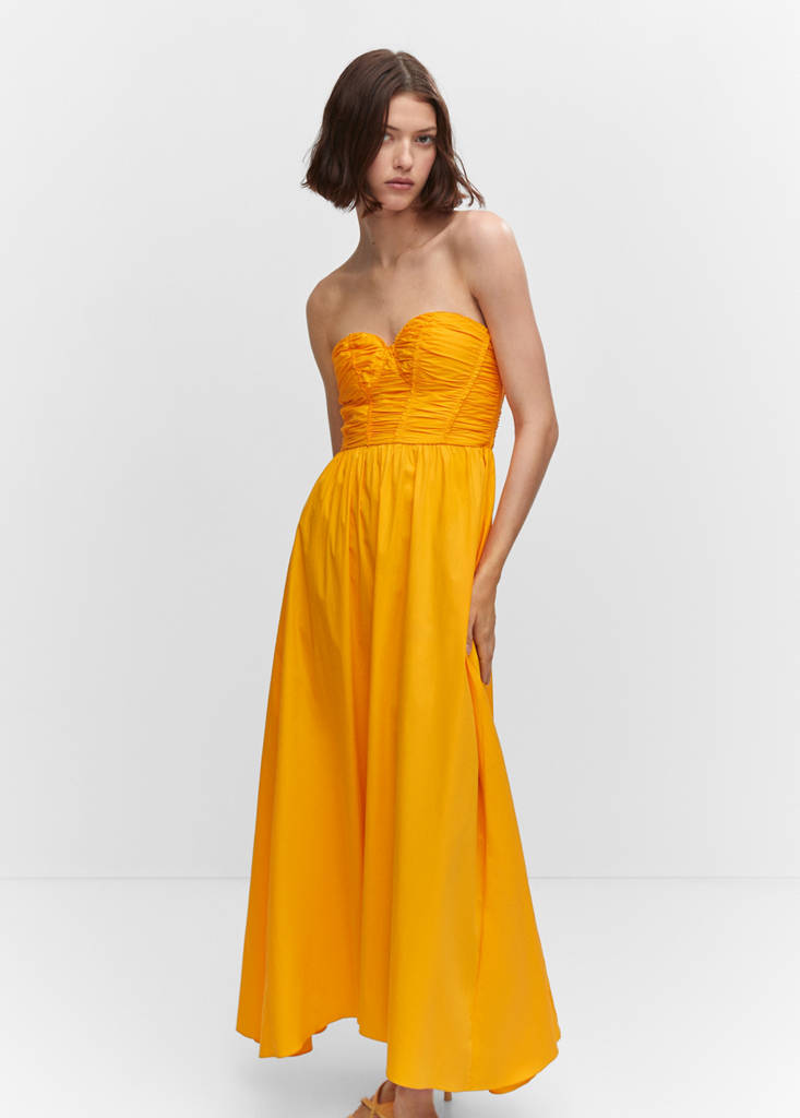 Tissu de coton mélangé. Tissu fluide. Style corset. Coupe longue. Évasé. Encolure en cœur. Bretelles fines. Bretelles ajustables amovibles. Élastique à l'arrière. Détails drapés. Doublure. Collection fêtes et cérémonies